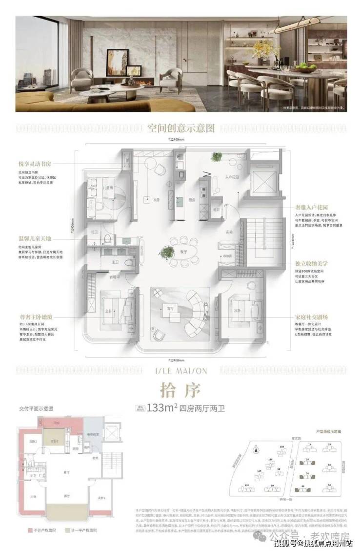 • 建面约133㎡四房两厅两卫,采用南厅北院格局,可实现双向入户动线。入户花园灵动多变,可作为家庭的X空间;户型功能灵活度高,书房可与儿童房打通形成亲子套间,且动静分区明确。约5.7米社交宽厅配备270度环幕视野,南向客厅与双卧室构成三面采光布局,进一步强化了户型的南北通透感。