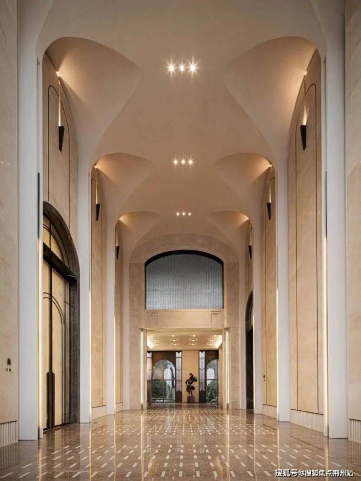 建筑以约12米阵列式拱券为基底,贝金米黄石材与宝格丽绿奢石层层叠加斯卡帕叠级元素,室内外运用近20种奢石,向外是城市美学坐标,向内是流动的自然画卷。园林引运河水意入园,五大主题景观铺展抬地之上,三面园林一面河,让每一扇窗都框定不可复制的风景。