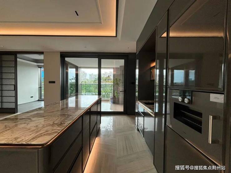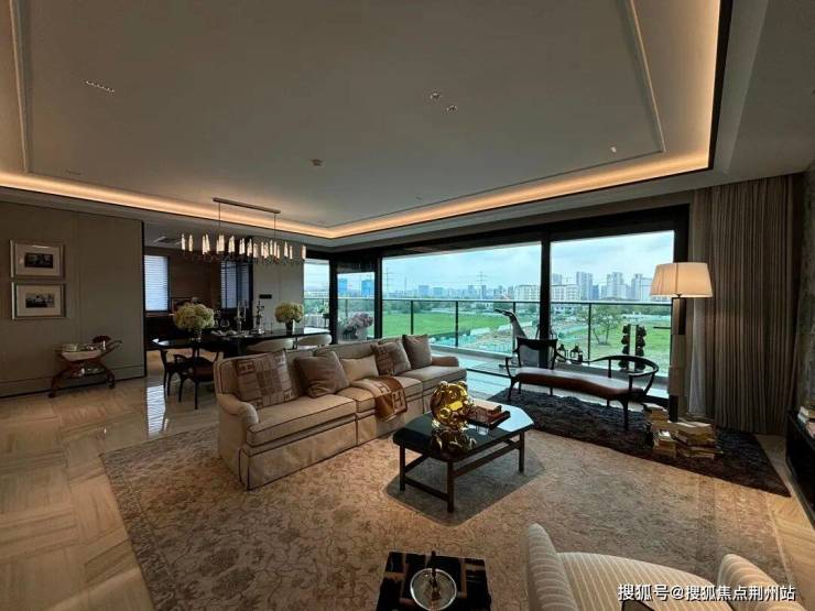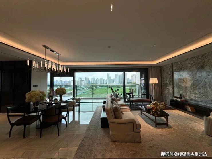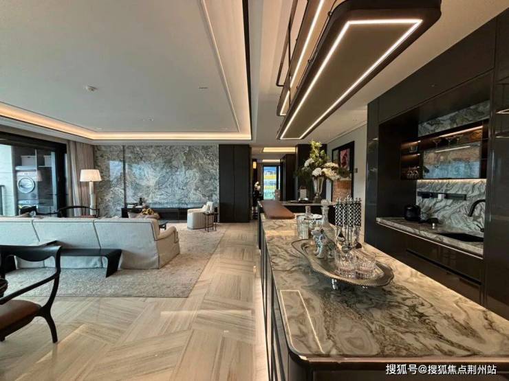 在元起观潮客厅中,最浓郁的场景肯定是餐客厅这里:北向有一个花园露台的感觉,餐边柜、岛台也都兼顾审美与质感。