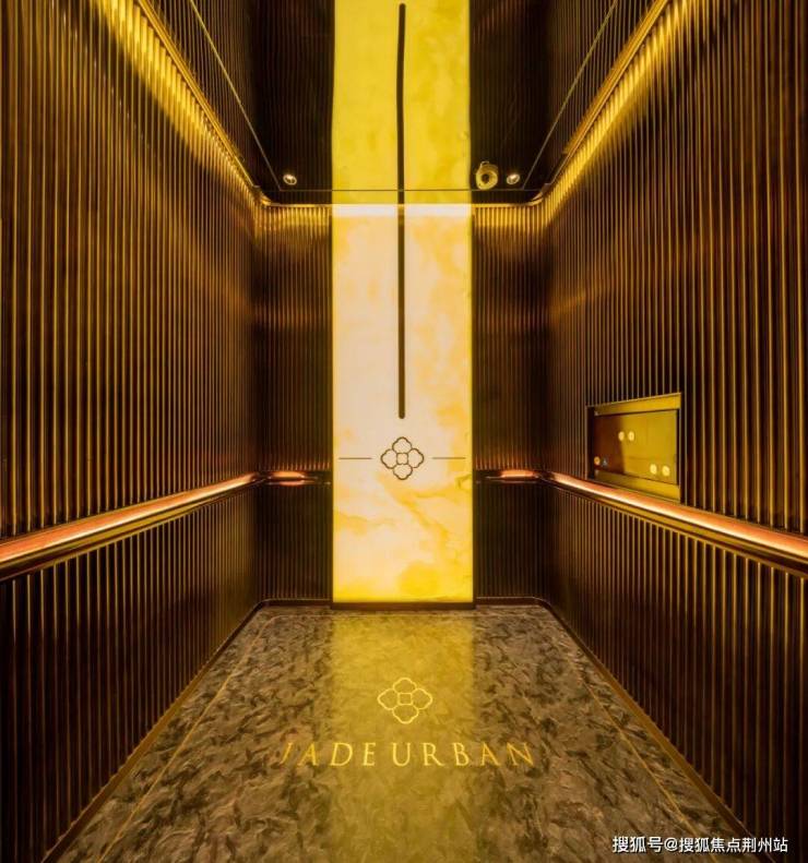 入口大堂地面通铺的是来自意大利的「范思哲黑」石材,这种石材不仅通铺在大堂的地面,还通铺到了楼梯,甚至通铺到了整个地下会所的空间。会所的电梯厅搭配一整面「雪山银狐」,地面用铜丝镶嵌LOGO。
