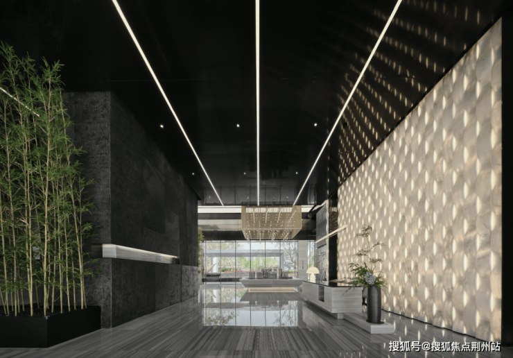 大堂整体视野开阔,大片玻璃幕墙消解了内外的界限与秩序,空间整体色调以黑白灰为主,强调大堂整体的静默美感,给人安静惬意的感觉。