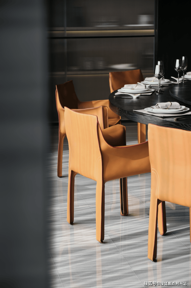 往前是茶室以及私宴区,茶室有两个门,拥有灵活的动线设计,既可以独立私密,亦可被纳入私宴作为会客区。北美黑胡桃木是空间大面积铺陈的基底,呈现出沉稳雅致的氛围。有别于传统茶室过于沉寂之感,选品上特意使用了朱红色烤漆的明椅款型,与配饰相结合,零星点点的朱红打破深色调的空间,在整体现代意式的室内风格中蕴藏了东方文化的基因。