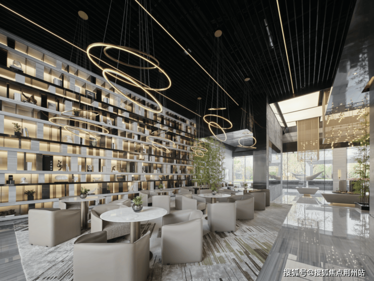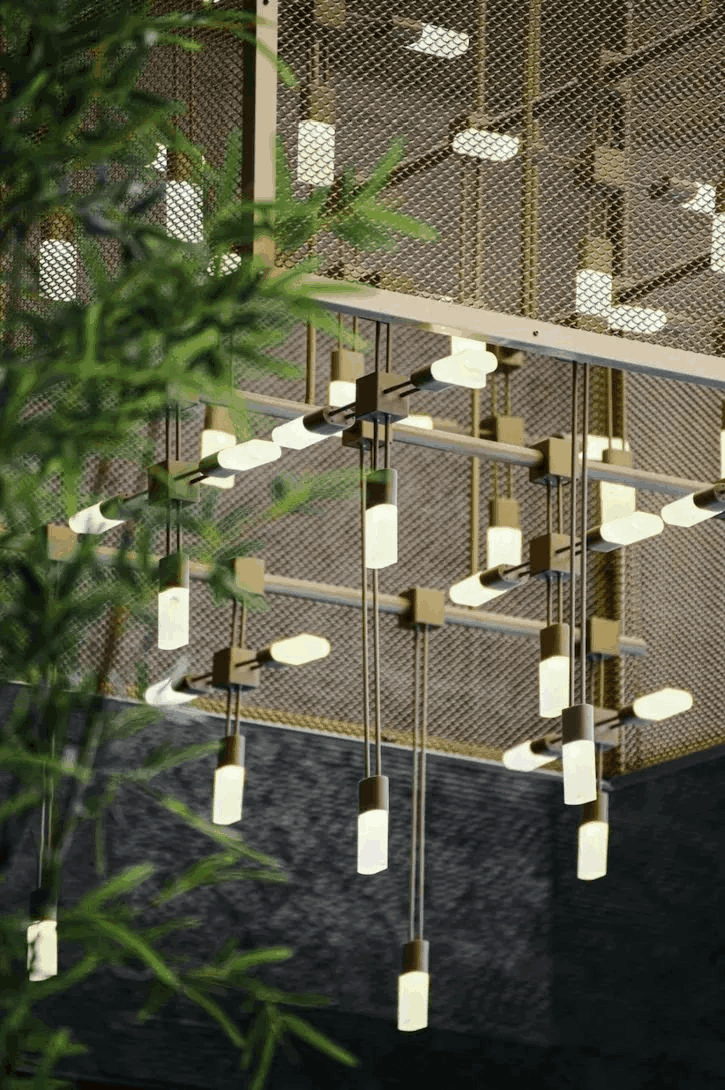 洽谈区内,近7米超高挑空空间,以相对压低的黑色金属天花设计,搭配六组三层吊灯作为装饰性点缀,灵动多变的造型为空间增添极致唯美的氛围感与仪式感,不论从室内亦或室外观赏,都给人以绝对惊艳的视觉效果。