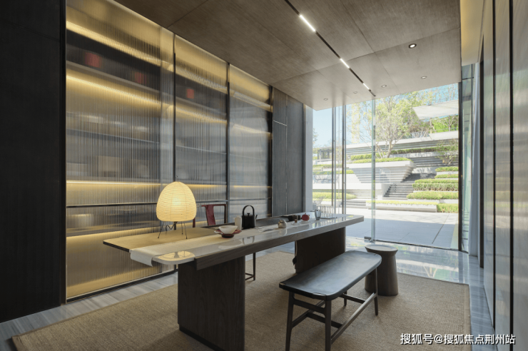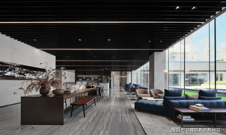 地下中庭大面积落地玻璃将景观带入户内,也最大限度带入了自然光、风、雨、水。地面材料延用营销中心同种石材,保持了空间的整体性。黑色金属百叶天花加线型LED灯条减弱了层高的局限性同时满足了照明需求。