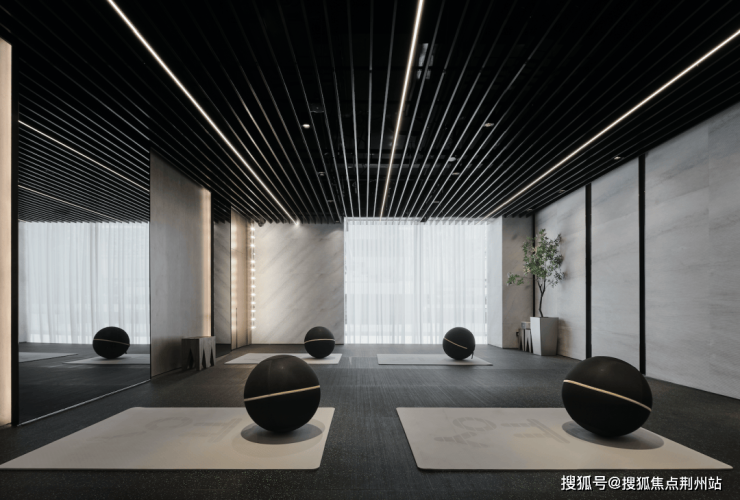 健身空间最里处设有宽敞的瑜伽室。角落处的吊灯以黄铜工艺结合磨砂玻璃材质,打在墙面上的光影与蛇形帘完美呼应。钢筋与石头的坚实也由此变得柔和,展现了瑜伽空间的至柔之美。