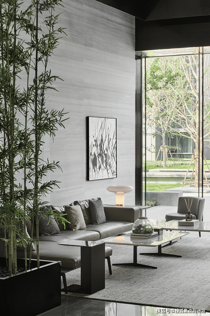 葱郁的竹子和落地的花艺装置带来几抹跳脱的绿意,打破硬装刚硬严肃风格的同时,也赋予整体空间清冽雅致的气息。