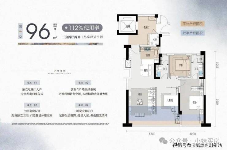 96㎡三房两厅两卫: 市面上很多100㎡还在做三房一卫,这个直接给你干到两卫,还是三房。约112%的使用率,你实际得到的使用面积,相当于市面上120㎡左右的户型。三个房间都实用,主卧套房设计,私密性好。这不是刚需房,这是“刚需的面积,改善的体验”。