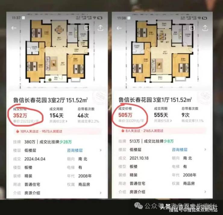 以鲁信长春花园套三户型为例,同一套房子,21年高位买入的业主,24年再卖出,单价从3.3万元/㎡跌至2.3万元/㎡,总价从505万跌到352万,一套房子净亏损153万。