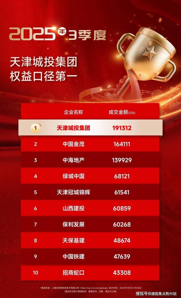 据克而瑞数据显示,在2025三季度天津市房企商品住宅权益成交榜中,天津城投集团以约19.13亿元,强势摘得榜首,于上半年良好发展态势上更进一筹,充分彰显国企在房地产市场中的强大韧性与稳健运营能力。值得一提的是,城投集团旗下重要的房地产板块——城投置地,凭借高端改善+区域深耕的双线推进,在三季度展现出深厚的市场根基与发展动能。