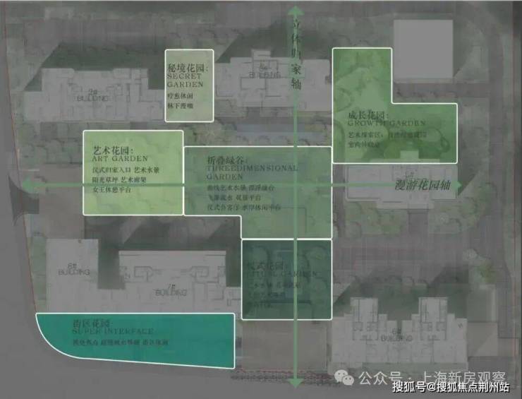 设计灵感源自新加坡艾迪逊酒店与《天空之城》“漂浮的拉普达”,以 “双轴五园” 为架构,打造约108米南北立体归家轴、约90米东西漫享花园轴,串联仪式花园、下沉庭院、儿童乐园、秘境花园、艺术花园五大花园。