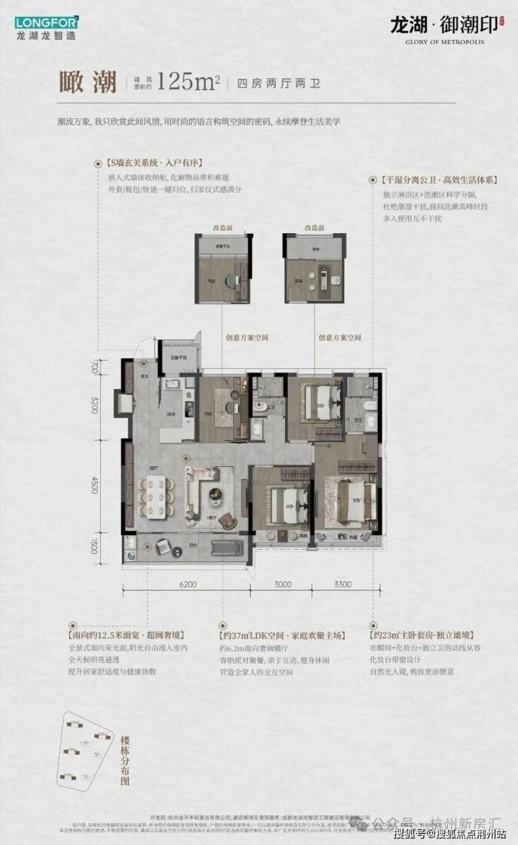 御潮印起步面积约98方,3房2厅2卫,南向约9.5m,双开间阳台全明户型。采用S墙玄关柜、主卧独立衣帽间等多种手段,提高储物效率。御潮印98方给了很多300万预算的朋友,买到钱江世纪城2.0的机会。