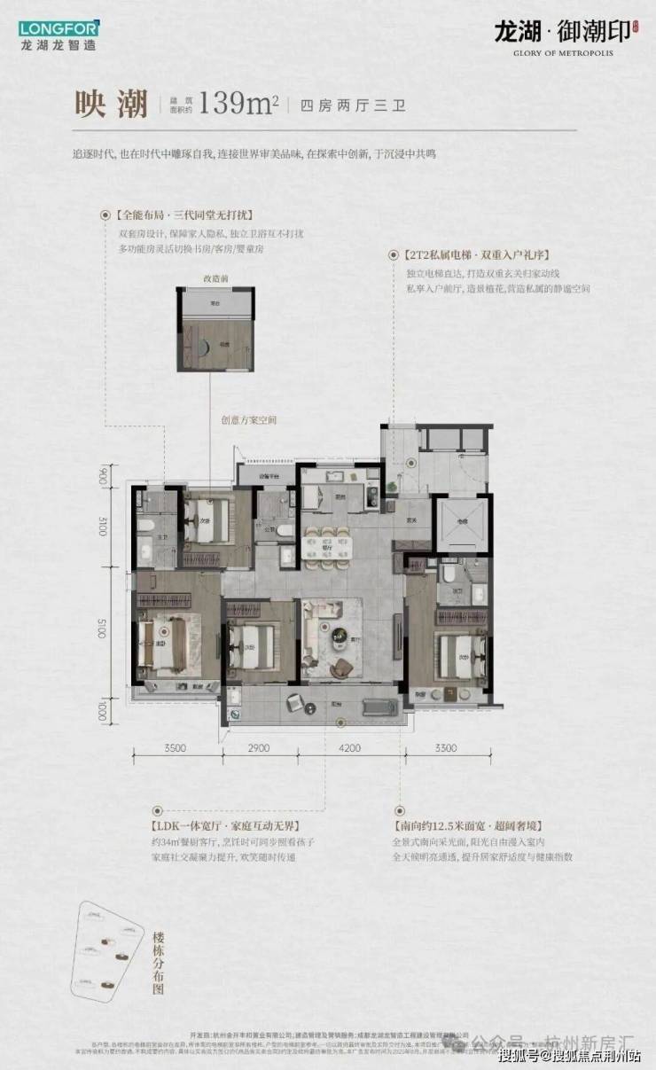 约139方户型,南向面宽则达到了惊人的约13.9m,四开间半朝南,客厅面宽约4.2m。关键做到了3卫双套房,特别适合三代同堂。同样约139方三卫,世纪城的君品是2T4的,而御潮印则是2T2,独立私梯入户,还拥有阳光入户花园和双重玄关。