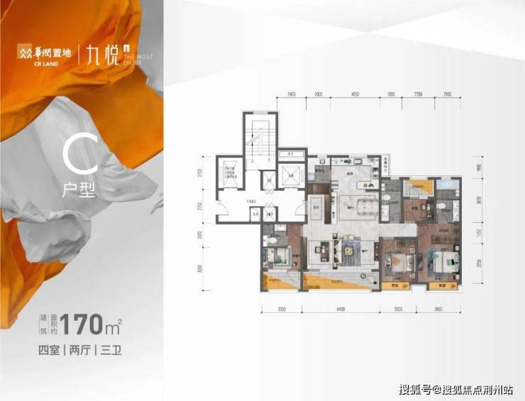 四室两厅三卫,墅级景观大平层户型,南向约16.3米的四面宽,客厅开间6.4米。南向3间卧室,双套房设计,每个功能都更加宽绰,更显尊贵感,是华润最新改良的的升级力作!