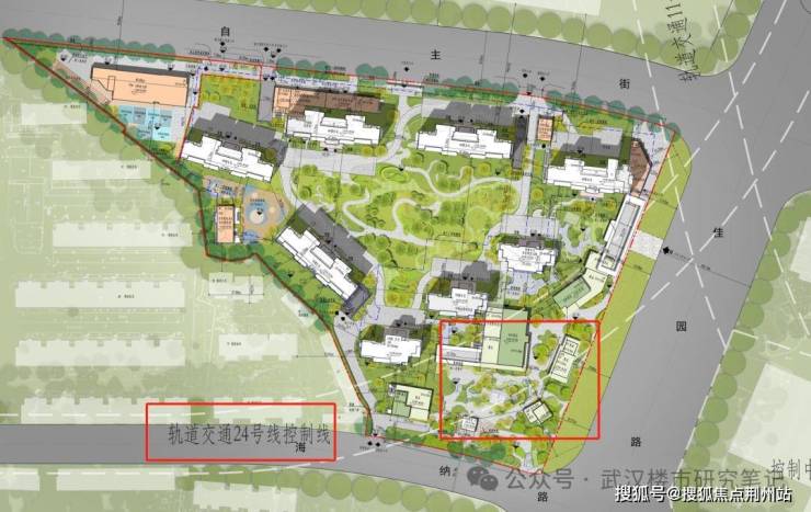 因为这个区域是地铁24号线的控制线,地铁控制线上方通常是不允许做住宅的,因此项目就在这里做了一片公园商业街区。这一定程度上,影响了住宅区域的规划效果,导致容积率仅2.5的地块,略显压抑。
