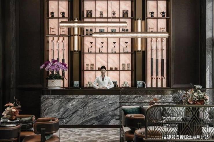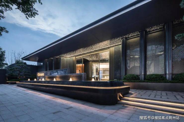 但是我们再看棠玥和境,五星酒店的入户大堂高约6米,横向延展约32米,生活体验馆外立面采用石材和香槟色铝板套线相结合,顶部使用铝板及星空顶,两侧选用造型感十足的的迎客松,并有跌水相呼应,充分展现出了高门大户的排面与高级感。