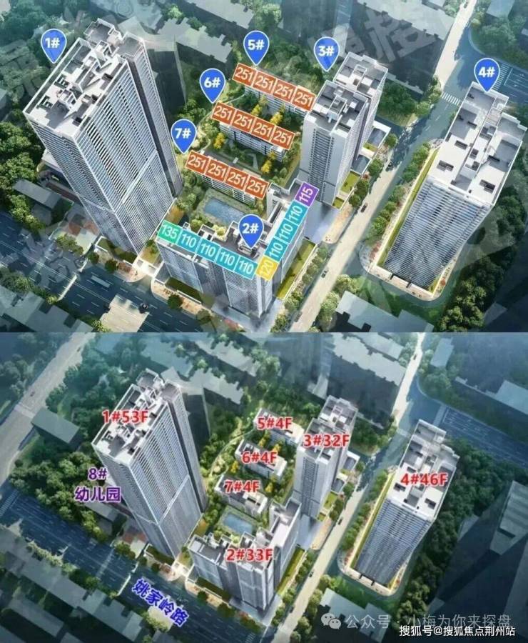 该项目商品房分布在1、2、5、6、7号楼,别墅5、6、7号楼。1栋一个单元,共53层,一层10户,2栋三个单元,一单元28层,一层4户;二单元33层,一层3户;三单元23层,一层3户,5、6、7栋均为2个单元,共4层,预计为上下叠,这也是武昌内环少见的别墅产品了,值得注意点是产品调换房位于3、4#。3号楼并未分开商品房区域分开。3栋2个单元,一单元32层,一层6户;二单元27层,一层7户。4栋2个单元,一单元46层,一层11户;二单元31层,一层3户。需要注意的是4栋是一个独立组团,与其他楼栋被规划道路隔开了。
