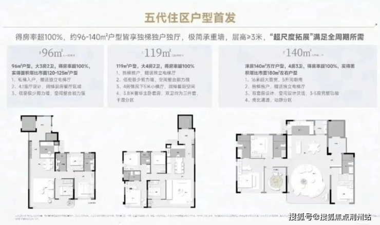 项目共规划5栋小高层住宅,因限高60米,楼栋高度分别为16层、17层及19层,产品包含362套小高层与22套建面约180㎡、带花园露台的城市平墅。户型方面,1、3号楼为140㎡,2、4、5号楼涵盖96㎡、119㎡、125㎡等多个面积段。