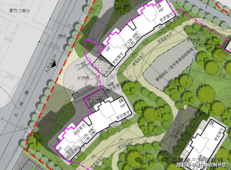 从规划图还能看到,项目住宅首层全架空,1、2号楼一线看江的则是3层架空,小区大门约52米宽,估计是搭配了4层会所,4楼设计有看江泳池等,入户后有户外的下沉庭院。