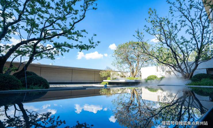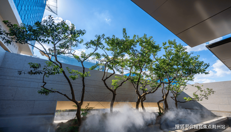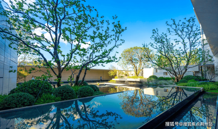 中央悬浮水院,宛如空中浮岛,令人流连忘返。步入其中,挑台水景悬于波光之上,潺潺流水自边缘轻盈跌落,珠帘散落,清越入耳。苍劲古朴的冬青与姿态婆娑的乌桕环绕水岸,为庭院注入无限生机。精心雕琢的景石点缀其间,光面与自然相互咬合,构成景观的骨架与节奏,尽显匠心独运。