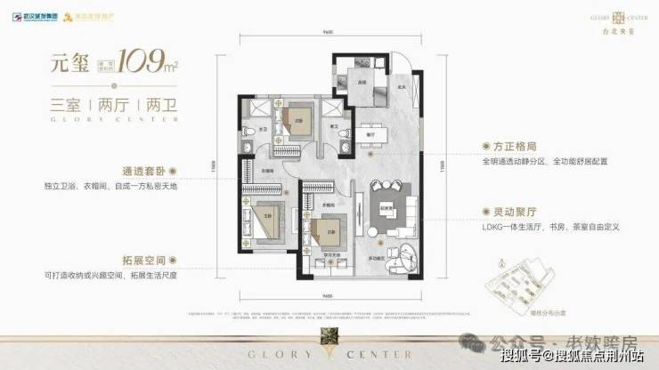 建面约109㎡三房两厅两卫,紧凑改善户型,中间户,南向面宽优越,布局方正,动静分区合理,独立阳台可拓展,满足三口之家日常居住需求。