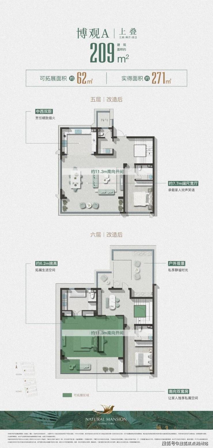 约209㎡上叠,约7.7米横厅+约6.2米挑高,约62㎡可拓展空间,三开间双套房直面三湾(7-503西边户实体样板间);