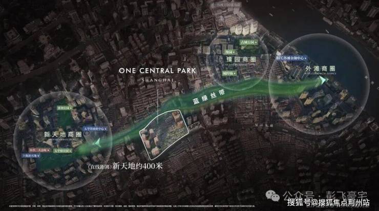 咫尺新天地 蓝绿丝带上的关键节点距离新天地直线距离约400米,作为蓝绿丝带规划上的关键节点,随着大新天地东进南拓战略逐步实施,通过水景、绿地和公共空间,串联新天地、豫园、外滩三大世界级商业版图。