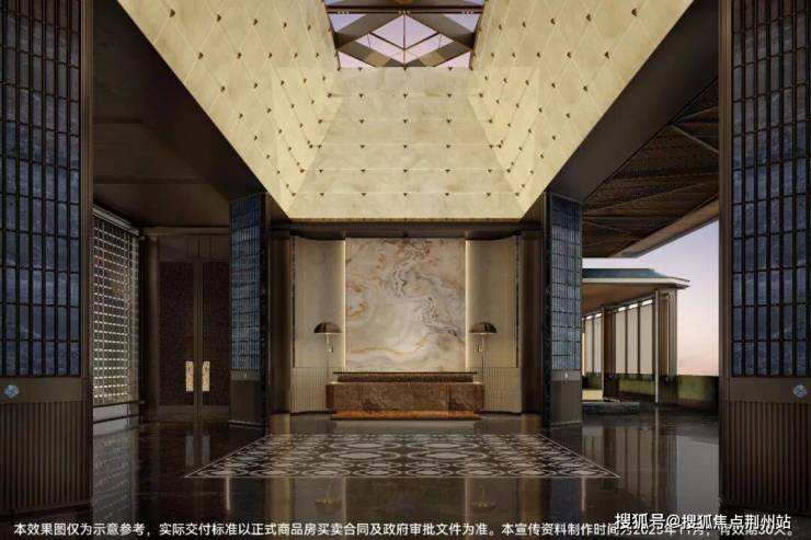 大堂内部同样以玛瑙玉奢石为背景,透过中央镶嵌的手工掐丝珐琅山水屏风,园区内的山水景致若隐若现;玻璃屋顶四周堆叠大量透光玻璃树脂板,呈向上收口的优雅造型,暗含传统建筑“藏风聚气”的吉祥寓意。