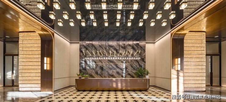 穿过水院,便抵达对标宝格丽酒店的社区大堂,社区大堂以约500㎡面积、约4.8m层高,打破传统大堂压抑感,奠定开阔基调,对称美学、石材与金属的材质碰撞,搭配亚克力与镜面反射,将接待空间转化为兼具尊贵感与艺术感的社交场。