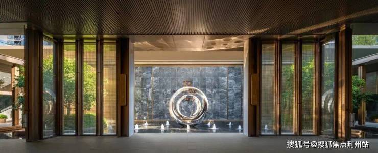 北区入户空间以 “三重院落” 构建礼序,第一进院落便是约60 米宽仪式感门楼前的镜面水院 ,这不是普通景观,而是温州人 “以水为财” 处世哲学的当代表达,粼粼波光温柔滤去 CBD 的钢铁丛林气息,完成从城市喧嚣到归家静谧的精神转译。