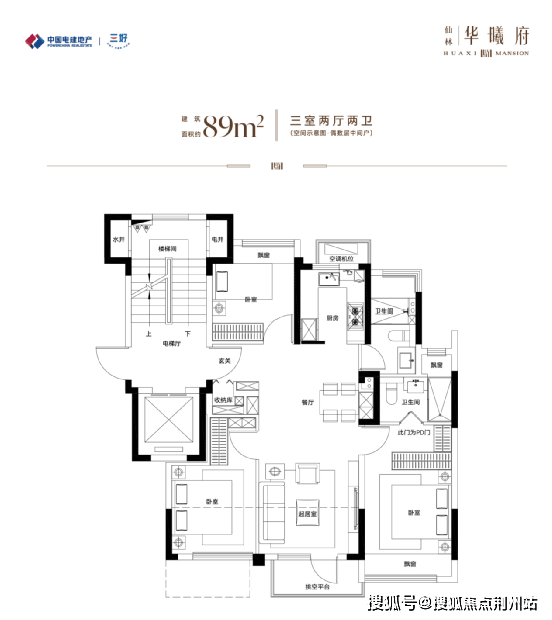 建筑面积约89m²三室两厅两卫 (中间户偶数层),刚需客户的品质优选。
