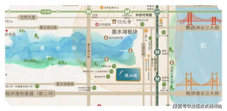汉阳二环核心,墨水湖东南岸。交通路网四通八达、二环内最大湖泊公园、全区顶配教育资源,奢华配套定义汉阳四代生活。