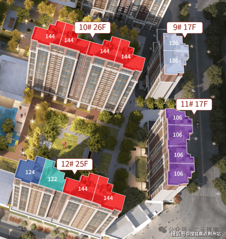 住宅整体建面约12万㎡,容积率仅2.85,由12栋小高层、高层围合而成,总高10-26层,两梯两户设计。
