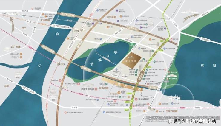 项目地块与中北路、沙湖大道为邻,快速通达全城。更一线直面沙湖全景,揽胜约10km湖岸线上的四季风情。华中金融主轴、武昌政务主轴、中央商业主轴三大主轴鼎立,周边多重商圈环绕,武汉SKP、楚河汉街近在咫尺,一城高阶资源精粹于此。