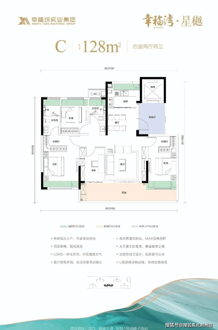 1、优化后空间使用率最高约94%;2、整层全部为128㎡户型,圈层纯粹;3、电梯临近入户,电梯厅前室无其他住户共享;4、四面宽朝南;5、LDKB一体化空间;6、大尺度主卧套房;7、南向贯通式阳台;8、L型厨房流畅动线;9、功能性双卫设计。