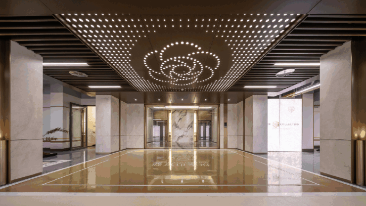 更豪横的是,晓风印翠的地库大堂做的像是地面大堂一样高级,芬迪白岩板作为主背景,墙面采用仿大理石瓷砖,加上景观植物的点缀,整个空间既奢华又温馨。