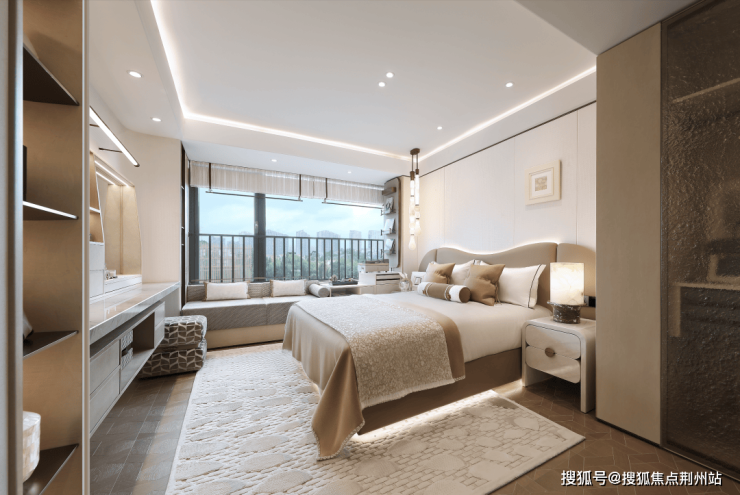在春来晴翠园建面约169㎡晴翠户型中,最亮眼的设计显而易见——主卧90°转角窗,揽获270°环幕视野,将天光云影尽纳室内。不仅引入绝佳采光与风景,更成为一处心灵栖所。