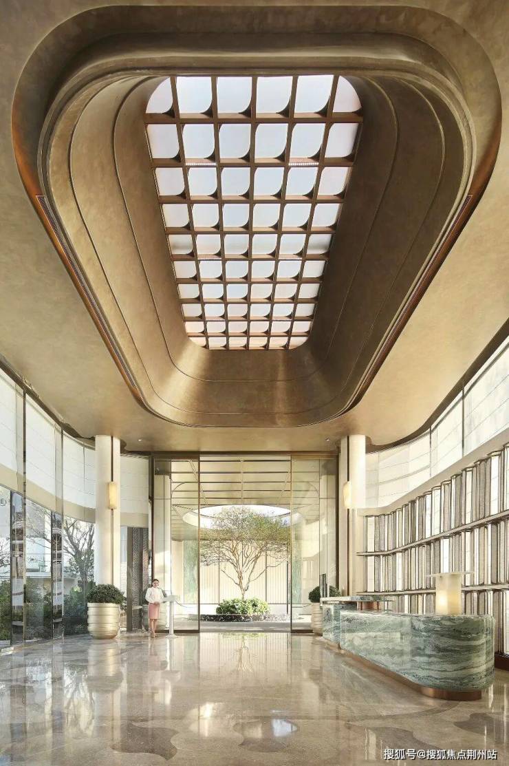 约7米高的主入口,把贝金米黄石材、维多利亚绿等名贵石材,与古铜色金属板、紫薇等名贵草木巧妙搭配、相得益彰,犹如穿着翠绿华服的翩翩公子,透着一身贵气。