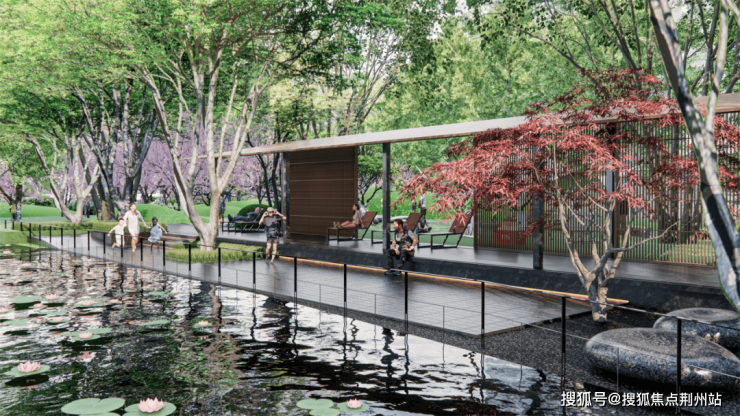住区景观以浮岛度假泳池围合中央空间,将五重植被景观递进串联,人文活力主题架空层与泳池上方的光岛图书馆遥相对望,集合阅览、休息、嬉水娱乐、养生为一体的第二生活活力空间,容纳生活的百般志趣。