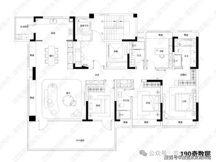 为本次产品亮点之一,采用私家电梯入户,实现“一层一世界”。约20.8米南向五开间面宽,约55.2平方米的宽敞方正客厅(方厅),南北两侧均设置带独立卫浴的套房,主卧空间开阔。