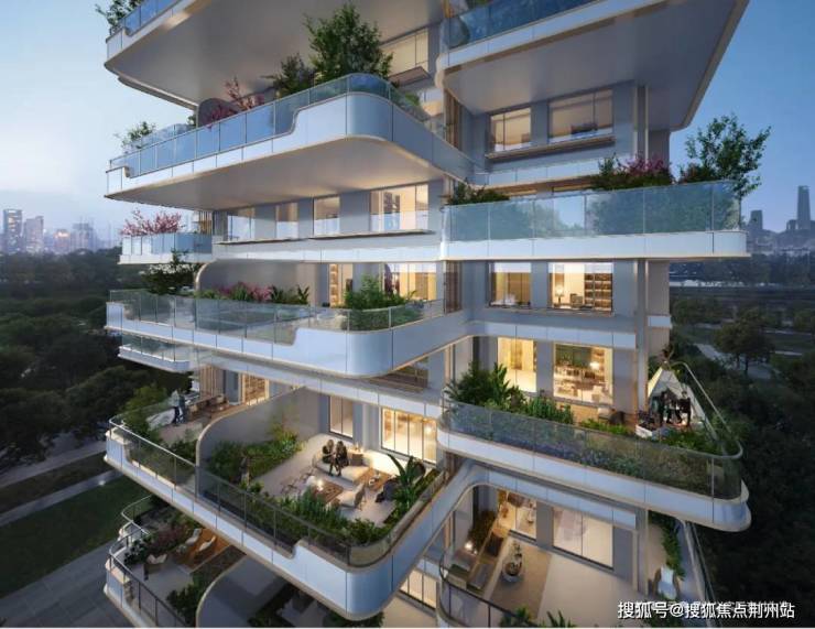 蠡棠森屿项目采用了苏州首创的错层阳台立面设计,户户拥有大露台。通过露台外伸、奇偶层错位的设计,以及客厅与花园两层通高联通的方式,以L型咬合方式形成环幕边厅花园,拥有270°的无遮挡开阔视野,形成真正意义上的空中庭院。