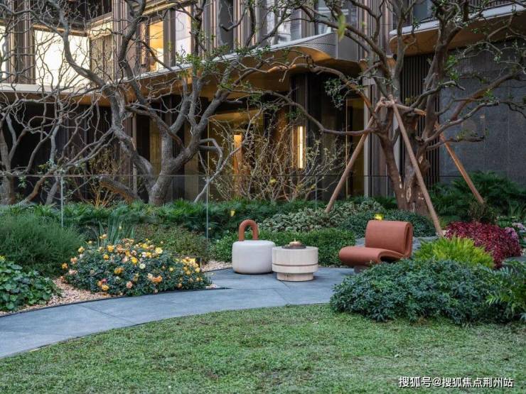 再向内走去,则是一处独属于女主人下午茶花园【望园小聚】。绣球的朦胧、紫薇的绚烂、桂花的清甜、石榴的热烈与鸡爪槭的静美,静静一同谱写静谧之诗。牛油果绿与贝金米黄奢石围合的角落,是花园里柔软的岛屿。