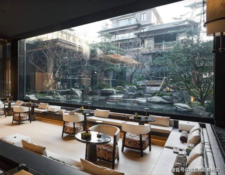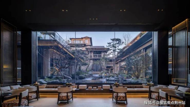 大尺度观景窗借景远山,竖向标高差强化仪式感,庭院中亭子的仰视视角塑造主峰山势巍峨之感