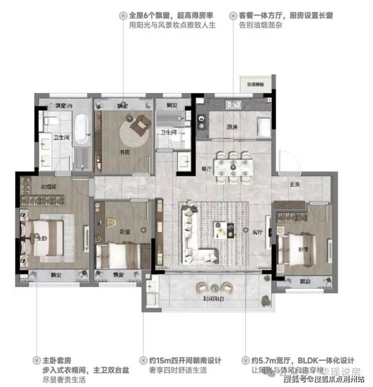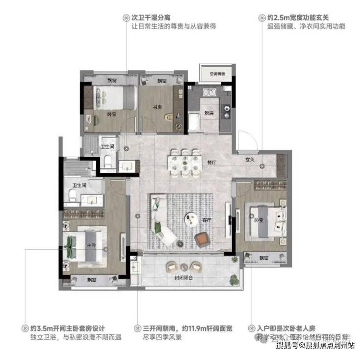 约5.7米大横厅连接大阳台,构成超大公区,根据家庭成员的需求随心容纳。
