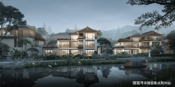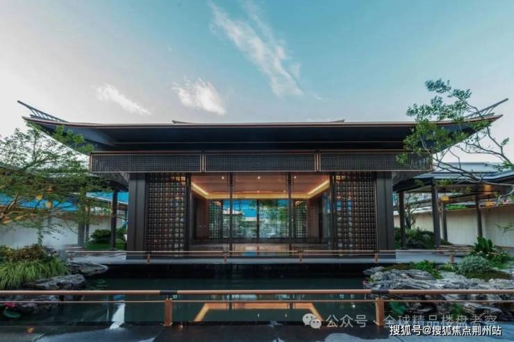 低层合院层高3.2m,南北通透,通过采光天井、全景落地窗优化自然采光与通风;立面采用浅灰色石材干挂+深褐色铝板干挂,屋顶采用装饰格栅+屋脊装饰构件等,中式风格。