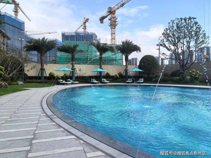 园林打造,是非常经典的滨江风,「蓝宝石」戏水池非常点睛,摆上吧台座椅,就像一个高级的「露天会客厅」。