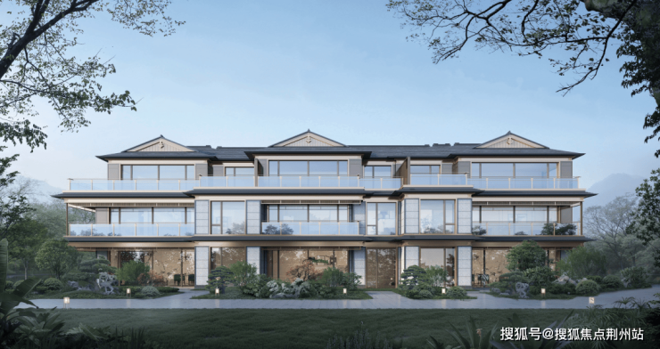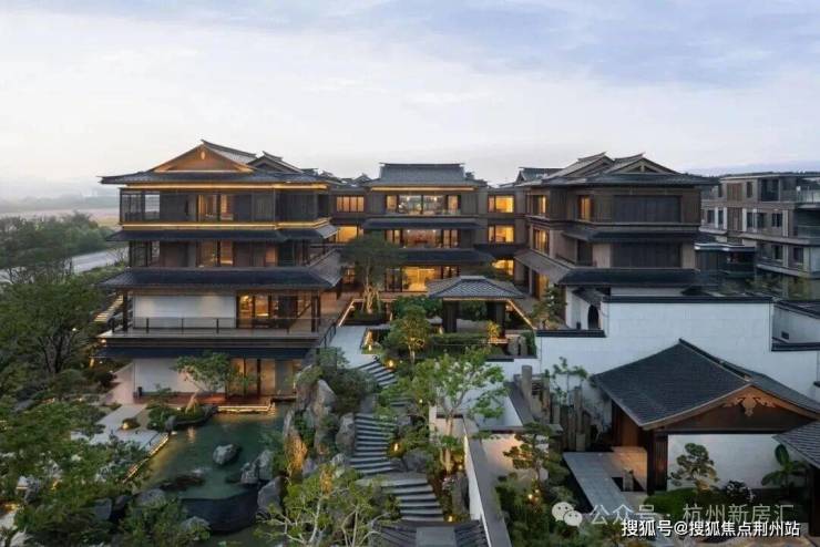 建筑立面:古今交融的诗意表达:外立面以香槟金铝板为基调,搭配蓝眼睛石材与玻璃幕墙,融合传统歇山重檐、纳福悬鱼等元素,既保留宋式建筑的对称美学,又赋予现代建筑的轻盈通透。合院组团采用三面庭院设计,L型景观面与环绕式檐廊,将超山梅影、丁山湖光引入每一扇窗景!