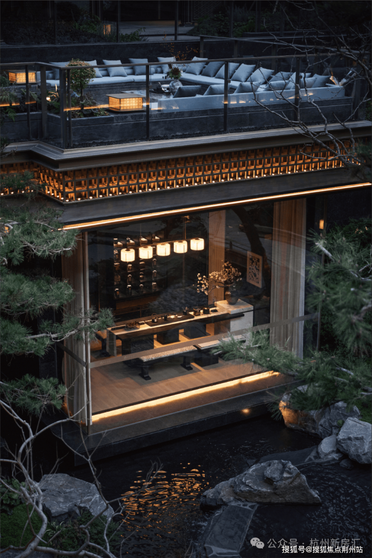 细看,还有歇山重檐、纳福悬鱼、黛墨青瓦、瘦金披檐等元素的点缀,这样的立面设计,将东方建筑之气韵、有形之光影,完美融合。如此超凡的建筑美学,在熙熙攘攘、繁华的杭州城,是独一份的。