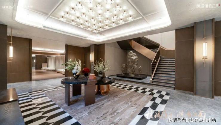 在绿城产品营造的理念里,门厅是家和世界的中转站,精神的停靠点。约50多米宽的超大尺度门头,展现出恢弘的气势,由香槟金百叶形成的景墙门扇阵列排布,勾勒巍峨门庭独有的雅贵气韵,富有高级感的“蓝珍珠”石材,纯手工打造的“十字花瓣”陶板,带来了强烈的归家仪式感和豪宅尊崇感。