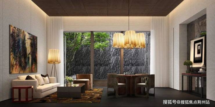 【心流盒子】:整个茶室空间由木材质进行包裹,天花木格栅造型延伸至墙面,打造出立于庭院旁的独特“木质盒子”。推开茶室折叠门,中心庭院的景观一览无余,示范区旖旎风光亦能尽收眼底。