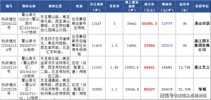 今年3月25日,蜀山单元(蜀山西片区)XS150102-05地块(杭政储出[2025]19号)经过7轮竞价由浙江杰立以总价26451万元、溢价12.79%竞得,折合楼面价约16581元/㎡。